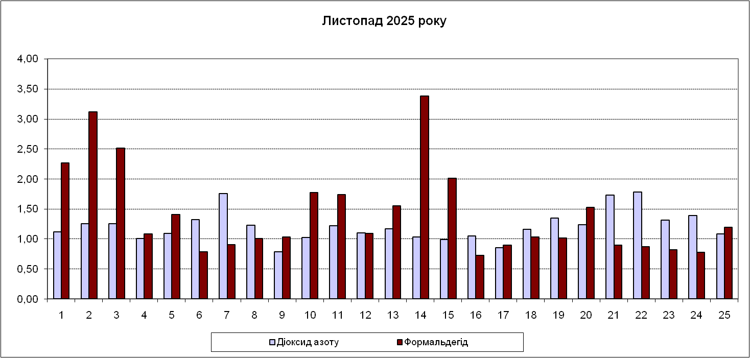 Порівняно з листопадом 2024 року, спостерігається ріст середньомісячної концентрації оксиду азоту та незначний ріст концентрації оксиду вуглецю; вміст решти забруднювачів нижчий торішнього.