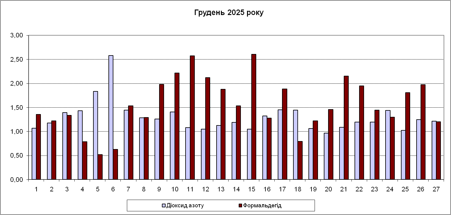 Порівняно з листопадом, в грудні спостерігається ріст забруднення атмосферного повітря міста діоксидом і оксидом азоту, оксидом вуглецю, розчинними сульфатами та формальдегідом; концентрації діоксиду сірки і пилу нижчі, ніж в минулому місяці.